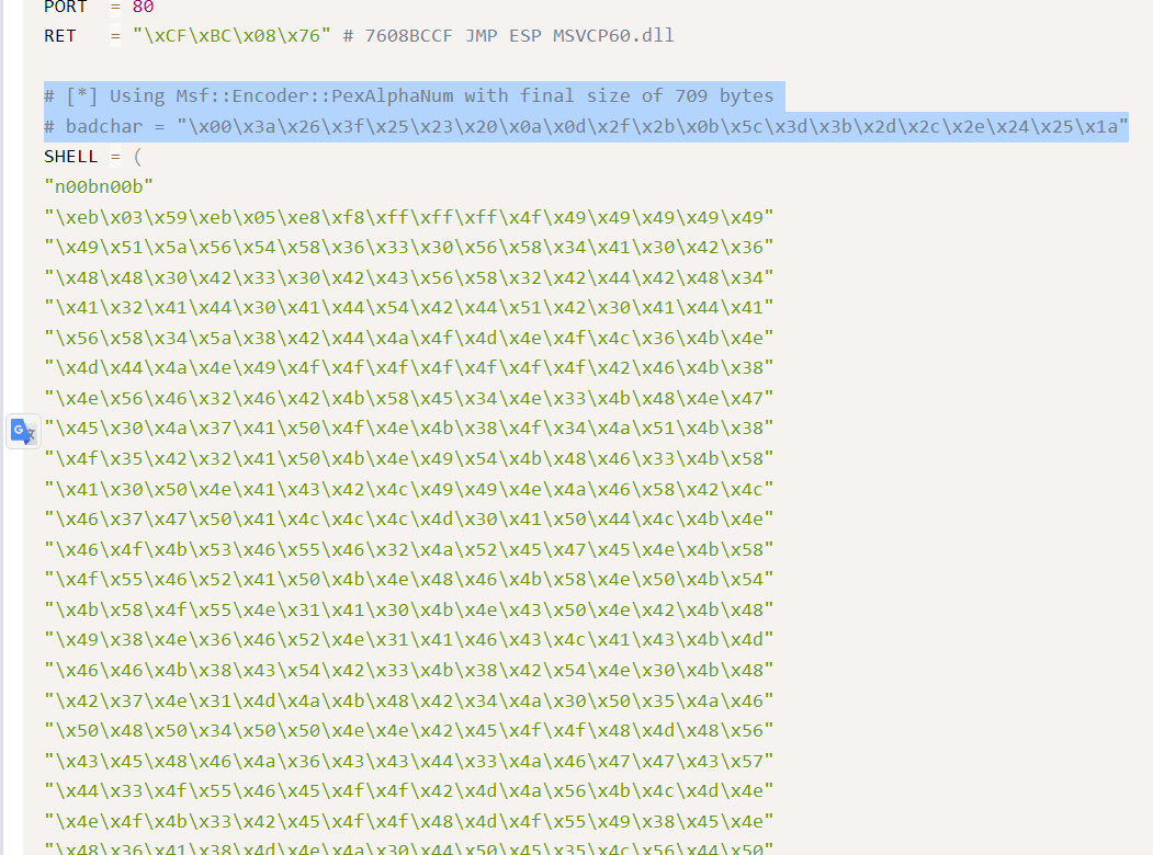 # badchar = "\x00\x3a\x26\x3f\x25\x23\x20\x0a\x0d\x2f\x2b\x0b\x5c\x3d\x3b\x2d\x2c\x2e\x24\x25\x1a"Google 搜尋 PexAlphaNum 看看,看第二個有 Metasploit 那一個