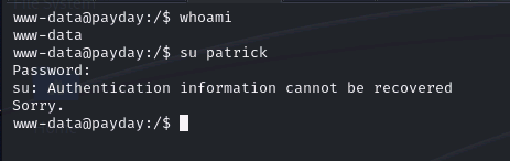 在原有 www-data 使用者的 tty 介面中要切換使用者 patrick 時,輸入密碼直接跳過無法輸入密碼